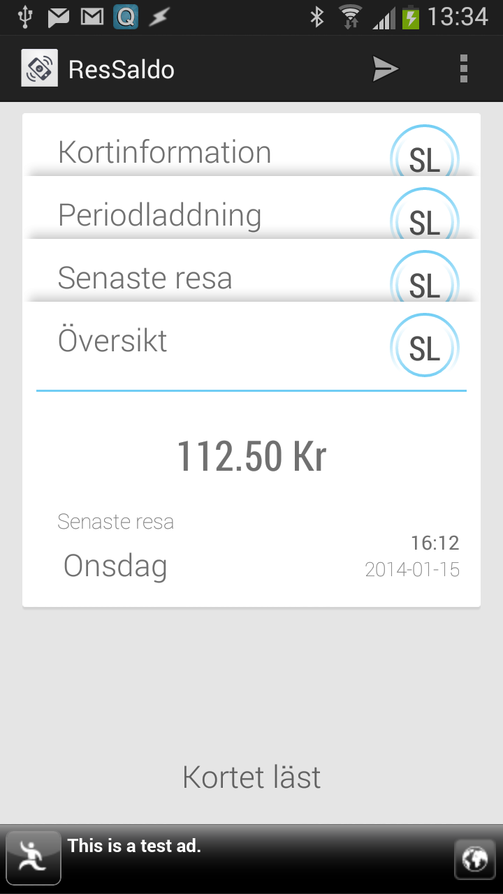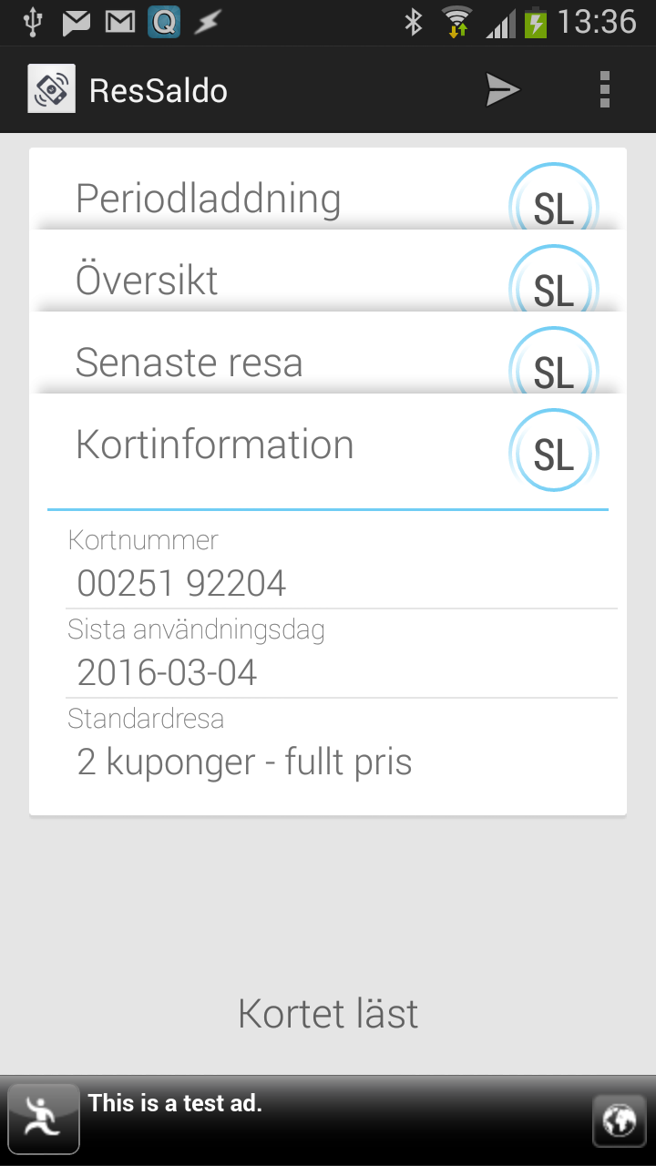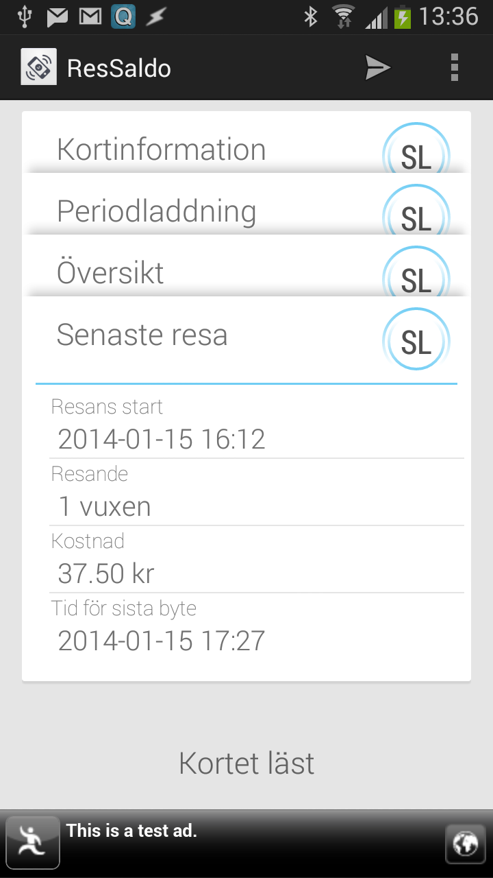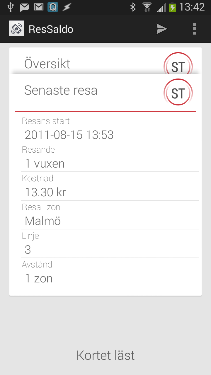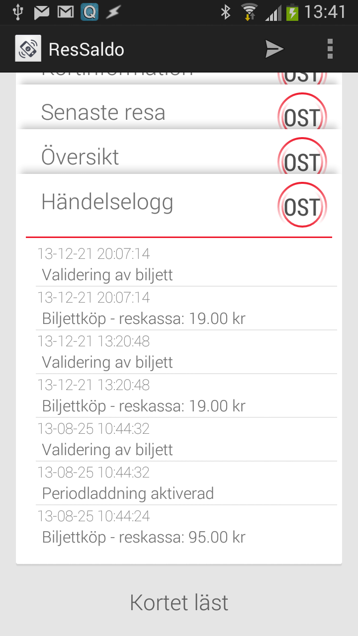 Med ResSaldo får du saldot direkt från kortet, och det är uppdaterat direkt efter att du stämplat. Appen visar: saldo, kortets giltighet, tidpunkt för senaste stämpling, sista tid för byte samt detaljerad information om senaste resan/stämplingen. Exakt vilken information som visas varierar lite mellan olika korttyper och resor.