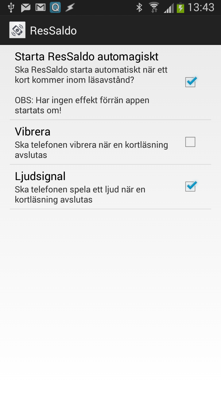 Dubbekolla att din telefon inte finns på listan ovan över telefoner som inte stöds. Kontrollera att NFC är påslaget. Håll kortet stilla mot baksidan av telefonen. Ta av eventuella skal/fodral som kan störa signalen. Starta om telefonen. Installera om appen. Om inget hjälper, hör av dig support@ressaldo.se, berätta vilken telefonmodell och vilken typ av kort det gäller!